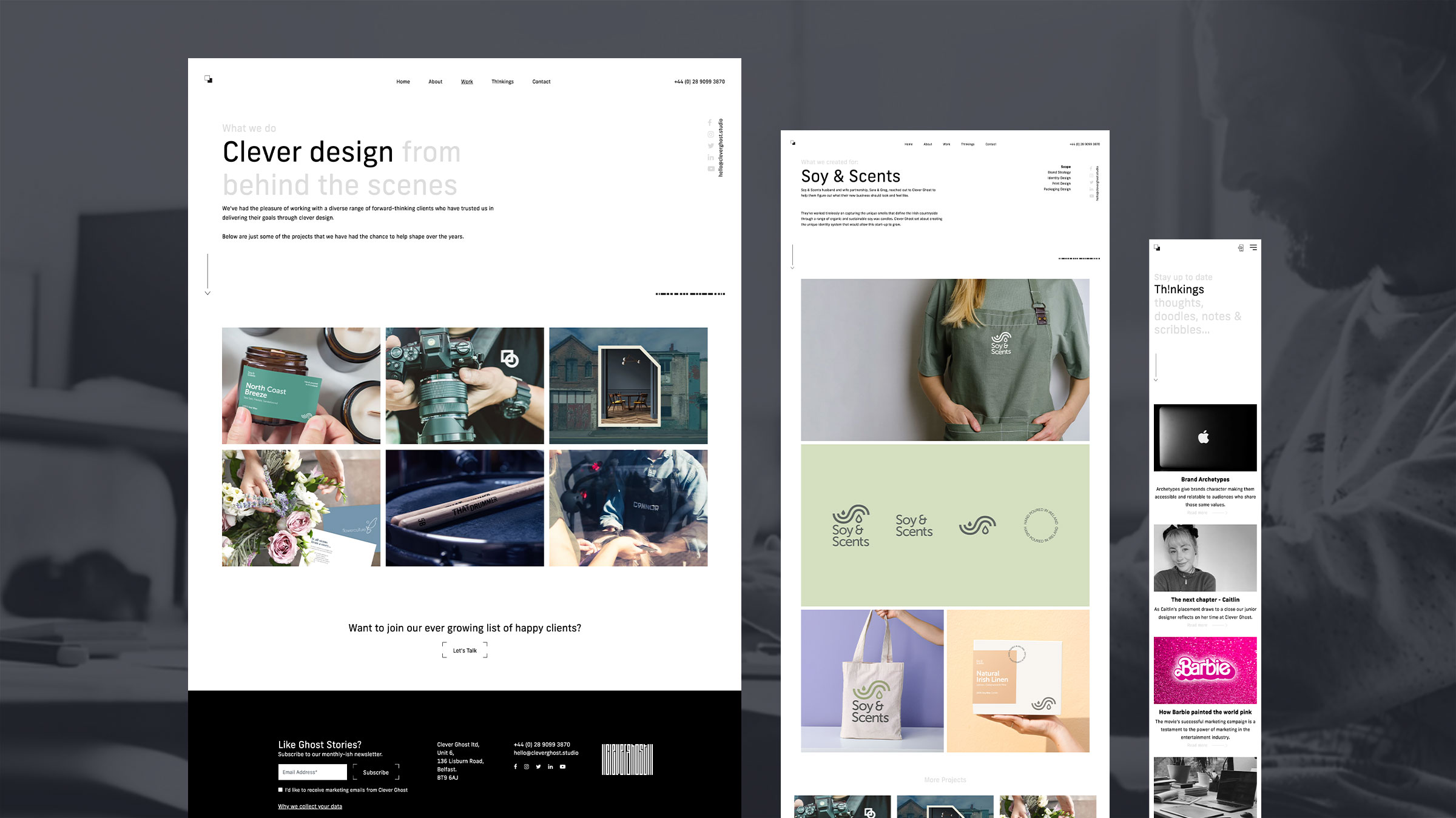 Visitors can view some of the companies latest work, showing a range of images displaying Clever Ghost's branding skills alongside information about the nature and scope of each project. If they like what they see, they can share a project to their social media pages or into a WhatsApp group/conversation. Potential customers can also find out more information about Clever Ghost, view their current client list and get in touch using a contact form or social media, email and phone links.